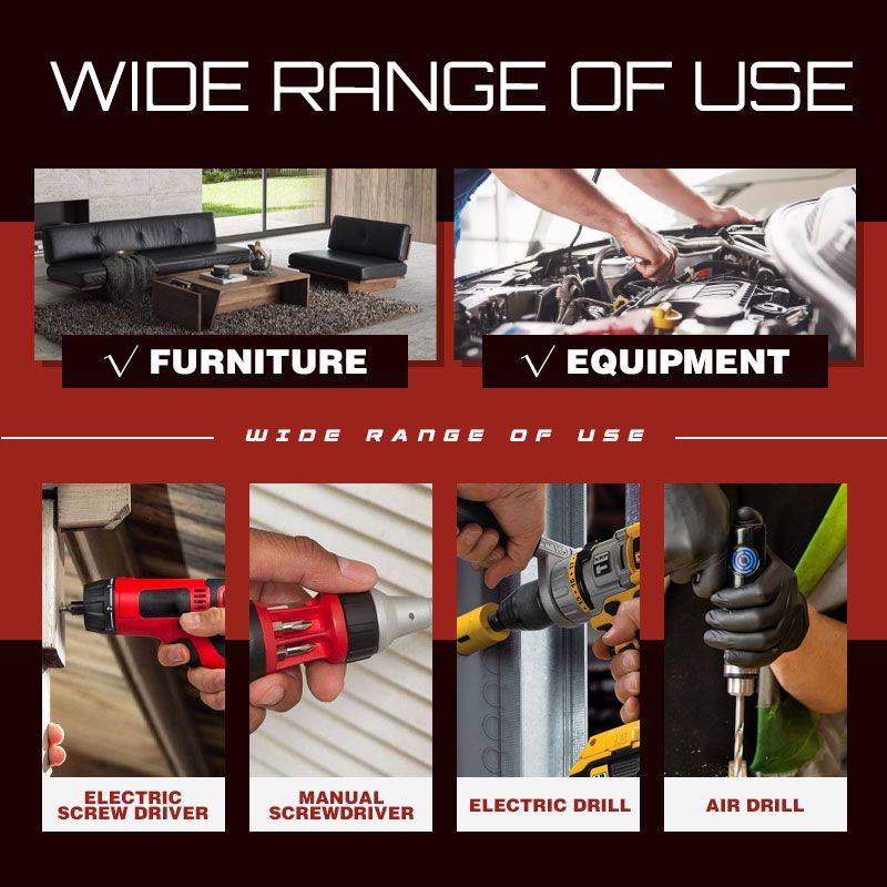 Standard 1/4” hexagon connector is suitable for pneumatic screwdrivers, electric screwdrivers, pneumatic drills, electric drills, hand drills, etc. Ideal for working on automobiles, motorcycles, bicycles, and furniture for easy furniture and equipment repair and disassembly.