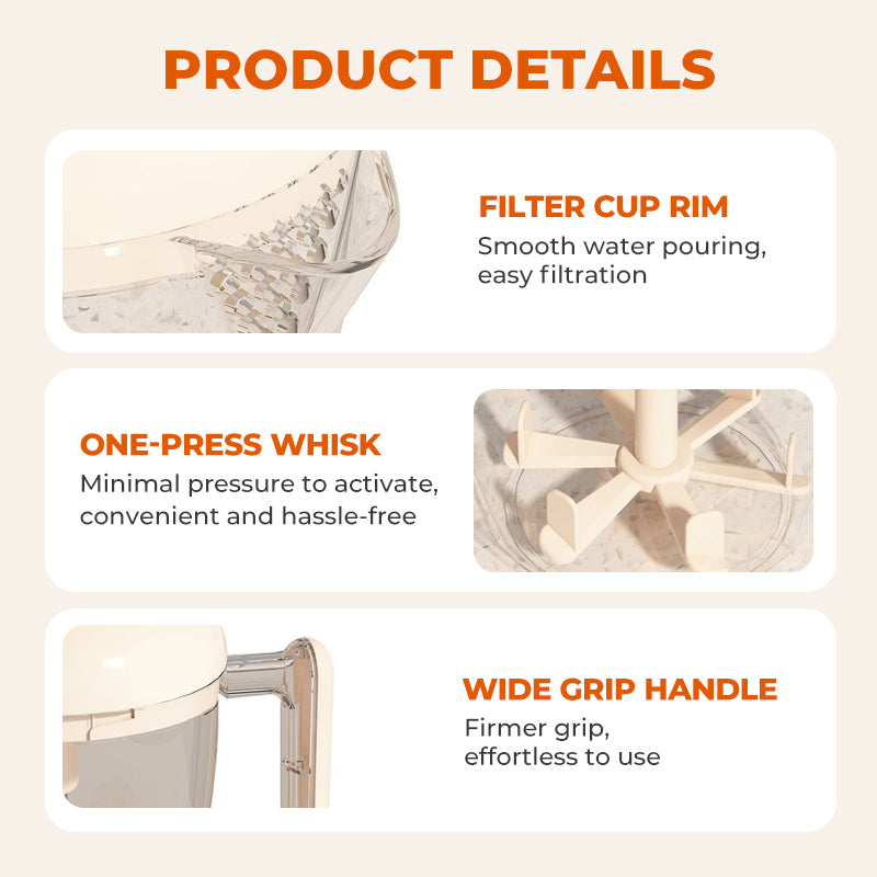 ONE-PRESS WHISK & CLEAN SYSTEM - The semi-automatic press mechanism requires minimal pressure to activate rapid whisking action. With just gentle downward pushes, the integrated beater creates perfect foam and emulsion with minimal physical effort. And the cleaning function activates with the same pressing motion used for whisking. This integrated cleaning solution requires no tools, transforming post-use maintenance into a simple rinse-and-reload process.