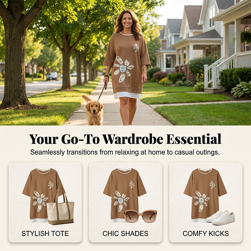 VOOR DAGELIJKS COMFORT - Ontdek de perfecte combinatie van stijl en comfort met onze losse T-shirtjurk voor dames. Met een chique bloemenprint en een relaxte pasvorm is dit de ideale keuze voor moeiteloos dagelijks gebruik.